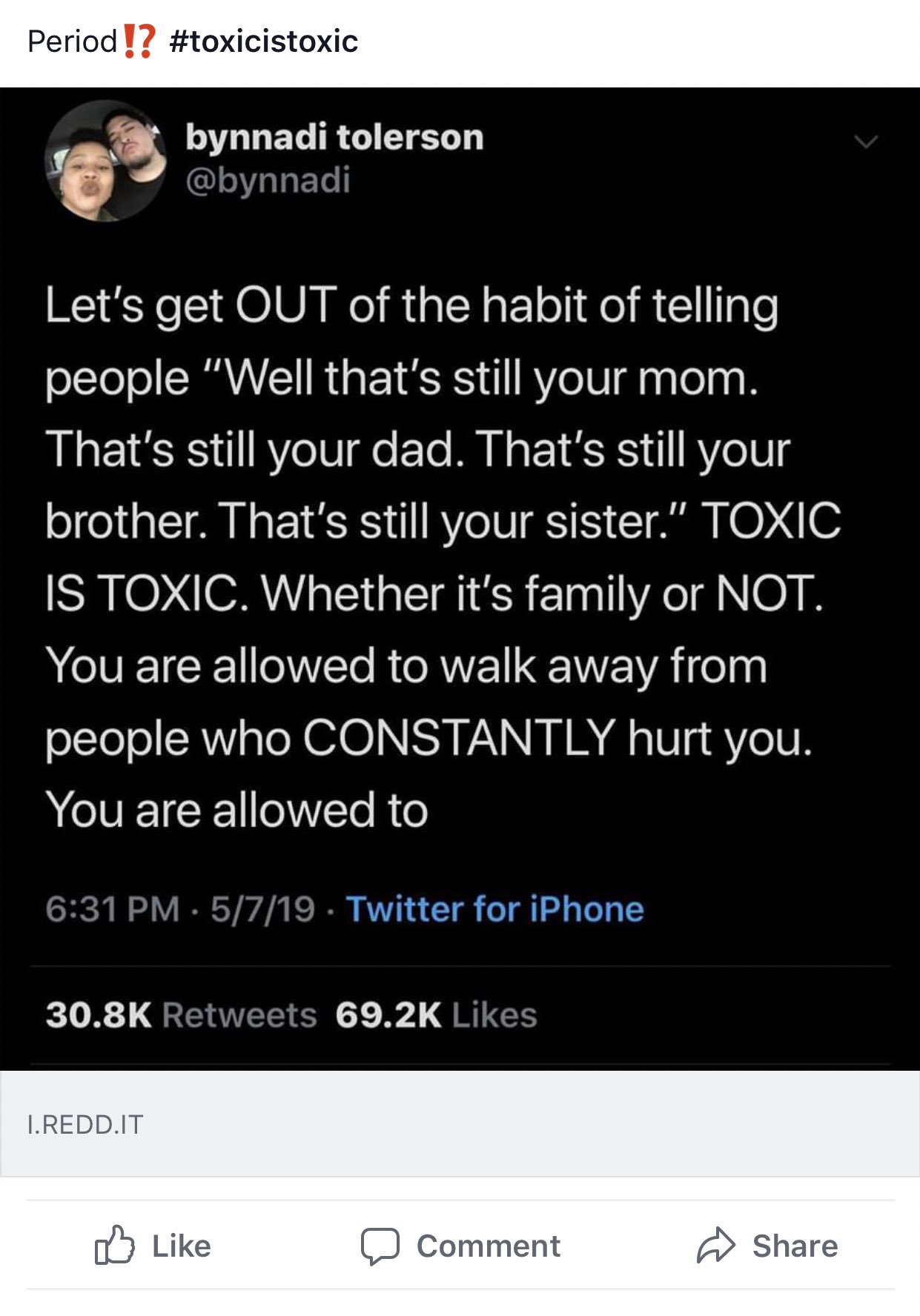 Do not succumb to this new medium that replicates all the sad toxic. A toxic family is even worst than a toxic relationship. Youre the person whos responsible for.